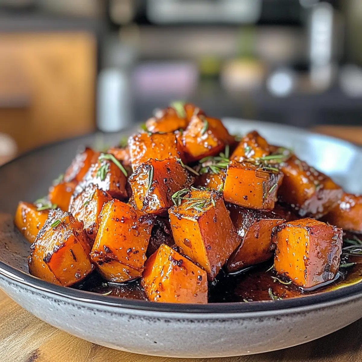 Transfer the roasted sweet potatoes to a serving platter. Drizzle with the maple-walnut glaze, and sprinkle with fresh thyme leaves just before serving to preserve their vibrant aroma.