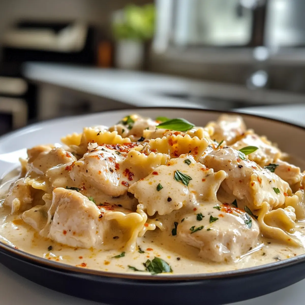 - Combine: Add the drained bowtie pasta and seared chicken to the skillet, tossing to coat in the sauce.