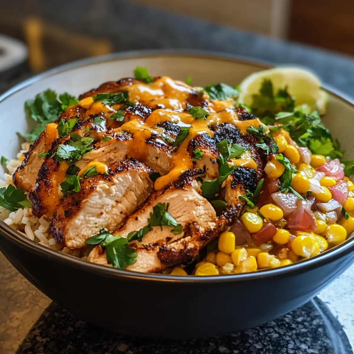 Assemble Bowls: Start by layering cooked rice in each bowl, followed by the sliced chicken, charred corn, diced red onion, fresh cilantro, and a generous drizzle of crema. Add lime wedges on the side for an extra zing.