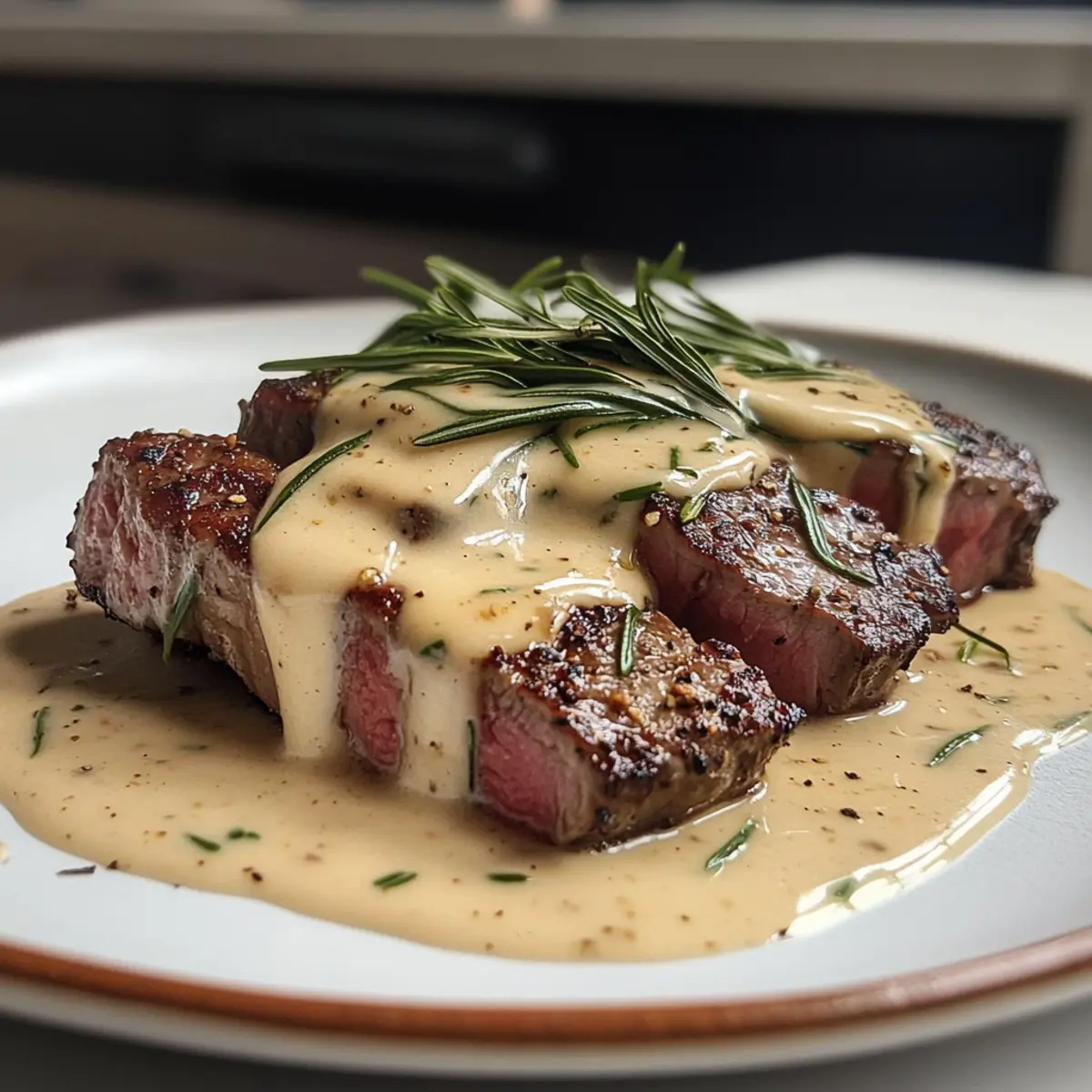 - Slice the rested steak, drizzle with sauce, and serve hot, garnished with herbs if desired.