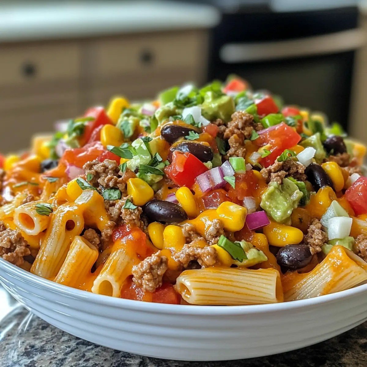Flavorful combination: This salad brilliantly merges the familiar taste of tacos with the delightful texture of pasta.